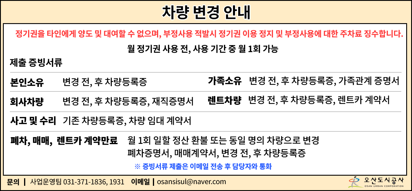 안녕하세요. 오산도시공사 사업운영팀 전산 담당자 입니다.주차포털 홈페이지 회원가입 시 제공되는 개인정보 수집 및 이용 동의 안내에서 내용 변경으로 인하여, 수정된 내용을 공지합니다.첨부파일을 확인하시기 바랍니다.감사합니다.